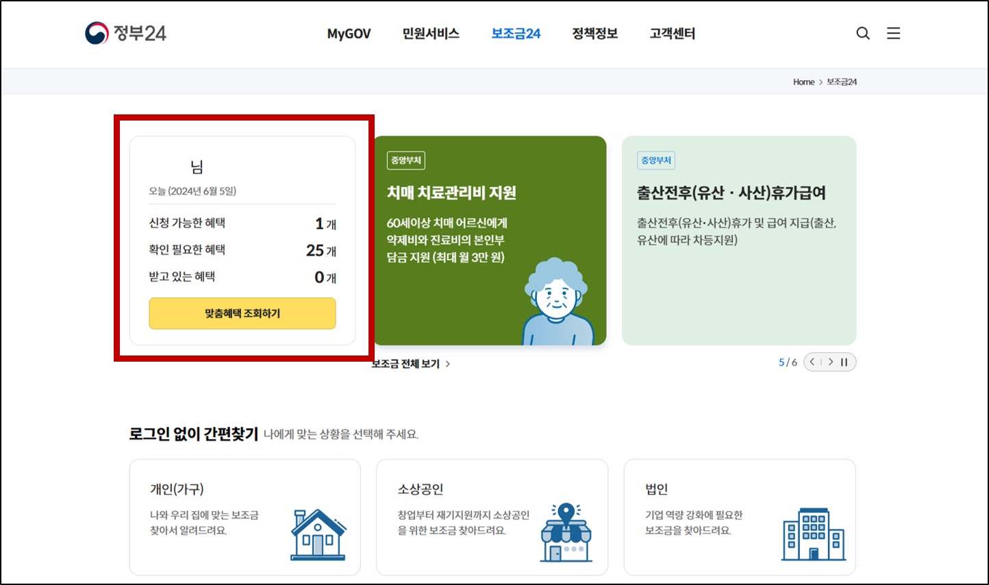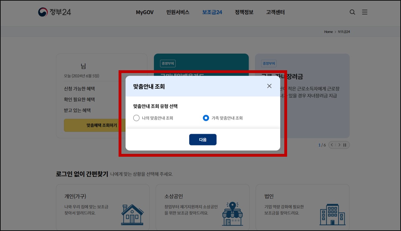 로그인 후 보조금24에 들어가면 본인 개인뿐만 아니라 가족들을 대상으로 지원하는 '가족맞춤안내' 내용까지도 조회가 가능합니다.
